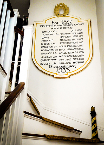 In 1978, when the Wyeths bought Tenants Harbor Lighthouse, Betsy found the keeper’s plaque in the basement. She renewed it and added the wreath to the top before hanging it at the top of the stairs in the keeper’s house. It is unknown who first created it, but there are photos of it hanging outside at one point. Back to the edition of: Jan/Feb 2022
