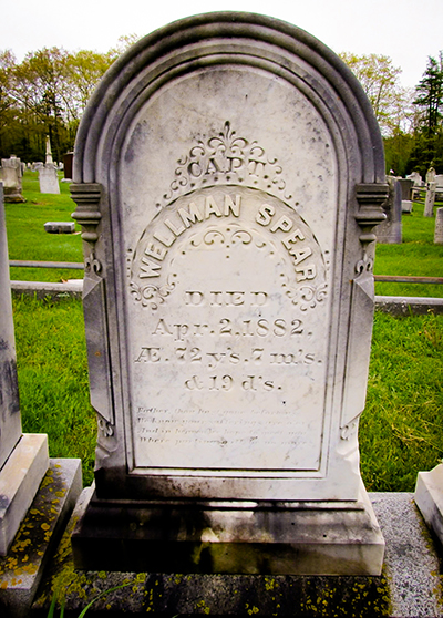 Gravestone of Wellman Spear, Sr., who was the lighthouse keeper at Maine’s Whitehead Island Lighthouse from June 5, 1860 to May 31, 1861 when he was removed from his job, probably because of political reasons. His son, Wellman Spear, Jr., served as an assistant keeper at Whitehead Lighthouse. Numerous records and stories have their first names incorrectly spelled as Welman or William, but we have verified that the correct spelling is Wellman. Wellman Spear, Sr. was born on August 13, 1808 and died on April 2, 1882. He is buried at the Seaview Cemetery in Rockland, Maine. Hopefully, the day will come when a U.S. Lighthouse Service Memorial Marker will be placed at his gravesite.