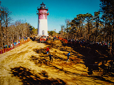 Nauset Beach Lighthouse when it was being moved in 1996. (Lighthouse Digest archives) Back to the edition of: Jan/Feb 2022