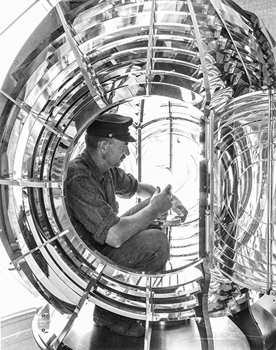 Point Vicente Light Keeper Anton Trittinger sits inside the Fresnel lens holding the 1500-watt electric bulb. The 3rd order lens is made up of 154 separate glass prisms. It was manufactured in France and valued at $7000 in 1935.