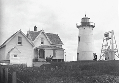 The Stratford Point Lighthouse, with its cast iron tower, pictured here in 1884, was built in 1881 at the entrance to Stratford Harbor, to replace an earlier wooden tower that had been built in 1822. It is shown here when the tower was entirely white, before the reddish-brown band was painted around the middle of the tower on May 15, 1899. Back to the edition of: Jul/Aug 2022