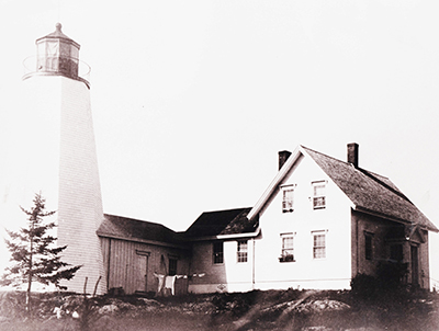 Vintage image of Dice Head Lighthouse in Castine, Maine. In 1858, wooden sheathing was placed over the round tower. This wooden sheathing remained until 1891 when it was removed. If you look closely in this photo, you will notice laundry hanging on a clothesline by the house, and the curtains are drawn in the lantern to protect the Fresnel lens from the harmful rays of the sun. (Lighthouse Digest archives) Back to the edition of: Sep/Oct 2022