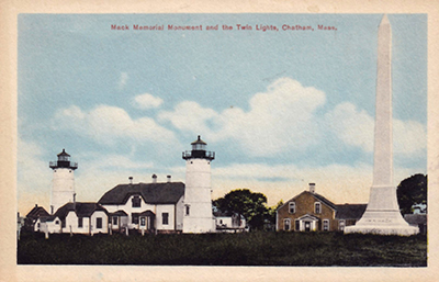 This vintage color post card, with a divided back, by J. F. Quilty of Chatham, Massachusetts, shows the twin towers of the Chatham Lighthouse and the nearby Mack Monument. The Mack Monument was erected in October of 1903 to commemorate the memory of William Henry Mack, owner of the coal barge Wadena, and its four crew members; and the eight members of the Monomoy Life Saving Station, who all lost their lives on March 17, 1902. On that day, the lifesavers (surfmen) had rescued all hands on the Wadena, but as they were returning to the mainland, a huge wave hit the lifeboat broadside and it capsized. The only survivor was surfman Seth L. Ellis.