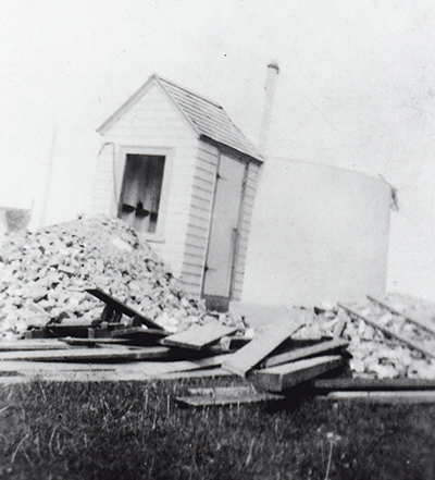This photo, taken by lighthouse keeper James T. Allison, shows a pile of bricks that was removed from the inner lining of the cast-iron Chatham Light north tower, after it was taken down and moved to Eastham, Massachusetts, in 1923. The wood entry building shown here was later demolished. Back to the edition of: May/Jun 2023