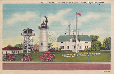 The flag flies high above the well-maintained and manicured Chatham Light Station in this vintage linen post card that was manufactured by E.D. West of South Yarmouth, Massachusetts. Notice the words on the lawn spell “United States Coast Guard Chatham Station.” Back to the edition of: May/Jun 2023