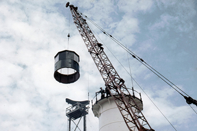 The 1877 lantern of the Chatham Lighthouse is being removed on April 15, 1969, and lowered to the ground by a crane to be carted away for a museum display. It was being removed to make room for a larger lantern to accommodate a rotating aero beacon. Back to the edition of: May/Jun 2023