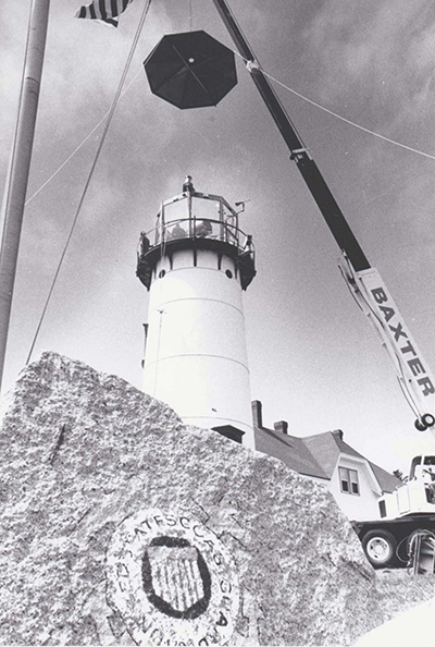 In this photo taken for the Cape Cod Chronicle, the cupola is shown being hoisted back to the top of the Chatham Lighthouse on April 18, 1993 after the new beacon was installed. Back to the edition of: May/Jun 2023