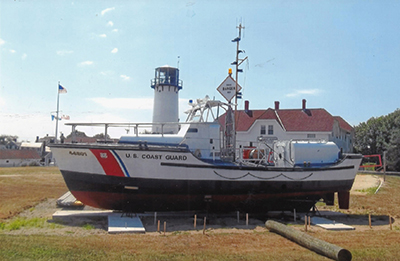 Chatham Lighthouse, with its new lantern, is shown in this photograph with the U.S. Coast Guard Lifeboat 44301 that saw duty from 1962 until 2009. When it was retired from service, it was installed for display at the Chatham Lighthouse and Lifeboat Station on May 6, 2016. Back to the edition of: May/Jun 2023