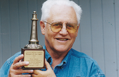 Bruce Roberts with his American Lighthouse Foundation Len Hadley Award for Volunteerism in September of 2000. (Lighthouse Digest archives) Back to the edition of: Sep/Oct 2023