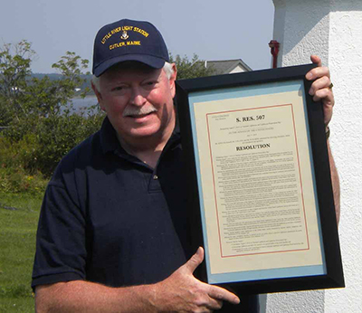 Timothy Harrison, editor of Lighthouse Digest, holds a framed copy of the United States Senate Resolution 507 that was introduced in the U.S. Senate by Maine’s Senator Angus King and passed by unanimous vote in 2014 which declared August 7 as National Lighthouse and Lighthouse Preservation Day. Back to the edition of: Nov/Dec 2023