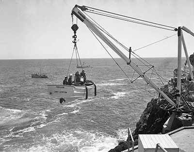 Helen Leslie Mabbott being hoisted ashore on South Farallon Island. Note the Coast Guard cutter in the background. (Photograph courtesy The Chronicle) Back to the edition of: Nov/Dec 2024
