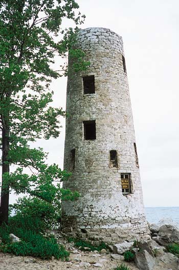 Pelee Island Lighthouse from a photograph taken by William A. Kellerman in 1904. The lighthouse was discontinued a few years later and the lantern room was removed. The lighthouse has been abandoned ever since. Photograph courtesy of Ronald L. Stuckey, RLS Creations, Box 3010, Columbus, OH 43210. Back to the edition of: March 2000