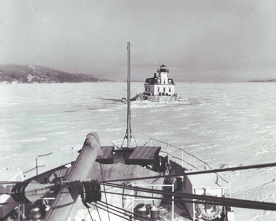 This photo was taken onboard the U.S. Coast Guard Cutter Firebush as it approached the Esopus Meadows Lighthouse in January of 1961 to offer assistance to the Coast Guard keepers after the electric power to the station was cut by the shifting ice. After its service in New York, the Firebush was sent to Alaska where it served until it was decommissioned.