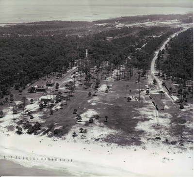 From 1952 to 1981 a Coast Guard Loran Station was in operation at Cape San Blas Lighthouse. It was during which time that this official Coast Guard aerial photograph was taken. Notice how far back the lighthouse was from the ocean. (Lighthouse Digest archives.) Back to the edition of: Jul/Aug 2012