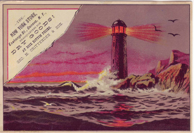 George N. Crittenden & Son’s used images of the two different Seneca Lake Lighthouses to promote their dry goods business, The New York Store, on these souvenir collectible advertising cards that they handed out to customers. The cards indicate that they were located on Exchange Street in Geneva, New York and other old records indicate they were once located at 29-31 Seneca Street in Geneva. It would be interesting if someone could do some research on the history of the business and share it with us. (Lighthouse Digest archives.)