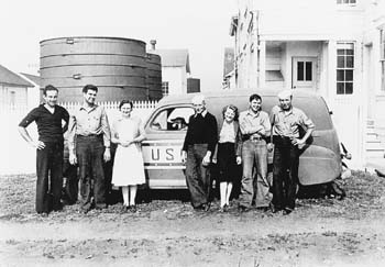 This vintage photo (circa 1940's) shows Coast Guard crew and family members posing at the Piedras Blancas Lighthouse. The photograph was donated by Norman Leon Francis, son of lighthouse keeper Norman Francis (1934-1948, including the transition years from the U.S. Lighthouse Service to the Coast Guard in 1939). Note the old Coast Guard van behind them. Boy, would we love to have one of those vans today. Back to the edition of: April 2000