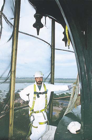 Chris Ford, technician for International Chimney Corp. of Buffalo, NY, posed for just a few seconds for this photo. Chris is working on the restoration of the braces of the catwalk of St. Augustine Lighthouse Back to the edition of: April 2000