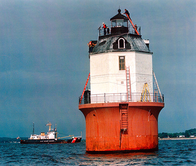 1998 image of the crew of the Coast Guard buoy tender Red Birch 687 painting the Baltimore Lighthouse. The crew used ten gallons of tar to recover the roof, 20 gallons of white paint for the main structure and 20 gallons of red paint for the cylinder. Later that year, on December 6, 1998, the Red Birch was decommissioned and transferred to the government of Argentina. (Lighthouse Digest archive photo by Ed Moreth.) Back to the edition of: May/Jun 2013