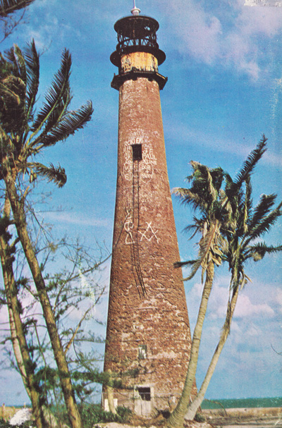 The date of this photograph by The International Oceanographic Foundation is unknown, however it clearly shows that the Cape Florida Lighthouse had been visited by vandals and had its share of graffiti, some of it high up on the tower. The vandals clearly risked their lives. The ladder to the upper window has been damaged and it is shown dangling. Back to the edition of: May/Jun 2013