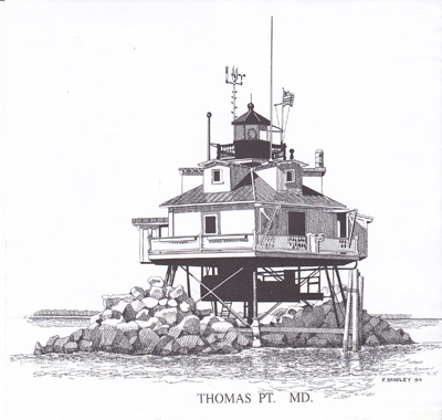 Pen and ink drawing of Thomas Point Shoal Lighthouse done in 1994 by Paul Bradley Jr. of Lighthouse Graphics. Back to the edition of: May/Jun 2013