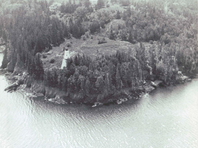 Aerial view of Eagle Island Lighthouse Station after the keeper’s home was destroyed leaving only the light tower and fog bell tower remained standing. If you look closely at the top of the image you will see two of the homes of island residents. (Coast Guard photo, Lighthouse Digest archives.) Back to the edition of: May/Jun 2012