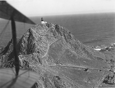 Although a visit by the lighthouse tender to the remote Farallon Islands Lighthouse Station off the coast of San Francisco, California often meant a visit by the lighthouse inspector, it also met that a new library would arrive. If you look closely, you will notice that this historic 1920s photo was taken from a bi-plane. Today the lighthouse is headless and what is left of the tower is rusting away. (Lighthouse Digest archives.) Back to the edition of: Jan/Feb 2012