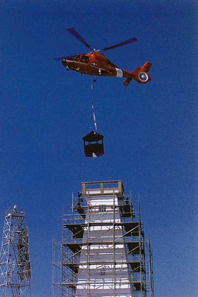 It’s the Coast Guard in action as shown here when a helicopter from Air Station New Orleans hoists a new cupola atop the new replica of Ship Island Lighthouse off Gulfport, Mississippi. This replica could not have been completed without the Coast Guard’s help. Photo by PA2 Patrick Montgomery. Back to the edition of: September 2000