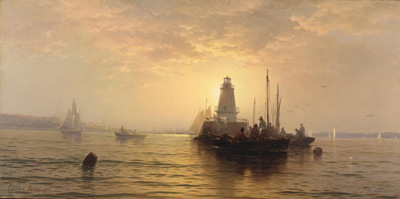 The Chrysler Museum of Art’s original Sunset, New York Bay by Edward Moran (1829-1901) is one of the original works of art on display at the Nobel Maritime Collection. It shows the original Robbins Reef Lighthouse that stood from 1839 to 1883 before it was replaced by the cast iron tower that stands there today. Back to the edition of: Mar/Apr 2016