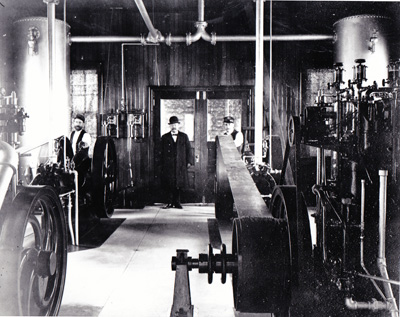 The engine room for the fog signal at Carquinez Strait Lighthouse shortly after it was completed. Two lighthouse keepers are shown with another man who may have been the Lighthouse Inspector. (Courtesy National Archives.) Back to the edition of: May/Jun 2016