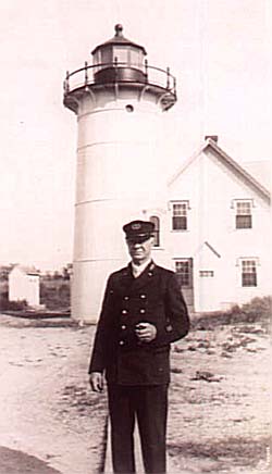 This old photo shows Race Point Keeper, James W. Hinckley who was Keeper from 1920 to 1937. Hinckley had to carry fifteen pounds of groceries tow and half miles to the light from Provincetown. He finally bought a horse, but the horse had difficulty in the deep soft sand. In 1935 he built what was possibly the first dune buggy to help him get supplies from town. When he retired from the U.S. Lighthouse Service on his 70th birthday on December 25, 1937 he appealed to the Lighthouse Service to give pensions to the widows of lighthouse keepers, since they were required do as much and sometimes more than the keepers themselves.
