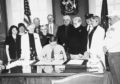 Governor Angus King is shown signing the Maine Lighthouse Week legislation into law. Behind him are members of the American Lighthouse Foundation (ALF) and the Friends of Rockland Breakwater Lighthouse (FRB) and legislature cosponsors. On the governors desk is a lighted replica of the Rockland Breakwater Lighthouse, which was presented to him as a memento of the occasion by the Friends of Rockland Breakwater. Left to right; Sandy Clement (FRB); Linda Muth (FRB); Senator Christine Savage; Timothy Harrison (ALF); Rep. Deborah McNeil; Senator Ken Lemont; Rep. Ron Collins; Dot Black (FRB); Ted Panayotoff (FRB); Pan Hooydonk (FRB) and Ken Black (ALF).