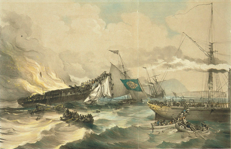 The destruction of the American emigrant ship Ocean Monarch, August 24, 1848, depicted in this 1848 illustration. The Morse Code flash of the Perch Rock Lighthouse memorializes the victims of this disaster. Back to the edition of: August 2001