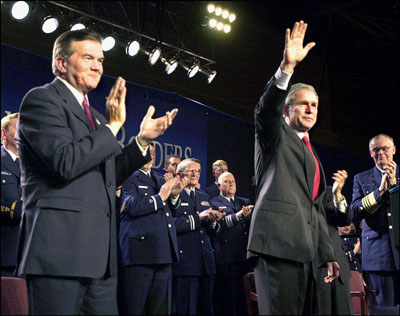 President George W. Bush waves to the crowd at Southern Maine Technical College in South Portland, Maine while Tom Ridge, Director of Homeland Security applauds, during a visit to Maine by the President and members of his cabinet. Behind the President are members of the United States Coast Guard. Photograph courtesy of the Portland Press Herald. Back to the edition of: March 2002