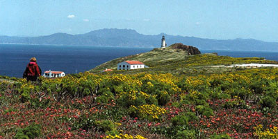 Anacapa Lighthouse. The red flowers in the foreground are ice plant, which has spread over the entire island. The red-roofed building to the left is the ranger’s residence. In the center is the church-like structure containing the water storage tanks. Beyond the lighthouse is the California mainland. Back to the edition of: May 2002