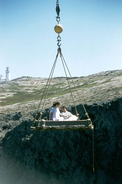 On September 15, 1956, the Whaleys returned to Anacapa Island with their first-born son. They rode up from the dock in the cargo box suspended from the boom on the upper landing. Leo Jr. looks at the lower landing 120 feet below, while Shirley watches three-day-old Leo III (Skip). Back to the edition of: May 2002