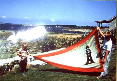 Capt. Frank Cotton’s “efficiency flag” held by Stephen Peterson (left) and Thomas Peterson (right). Photo taken by Clyde Cotton, son of Capt. Cotton. Photo courtesy of Mrs. Elizabeth Peterson.
