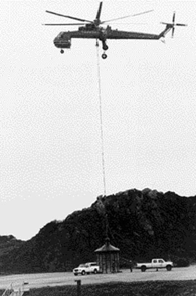 The air-crane (helicopter) is about to life off with the lantern room for the six-mile trip out in the ocean to the St. George Reef Lighthouse. Photograph by Phil Cox of Brookings, Oregon. Back to the edition of: July 2002