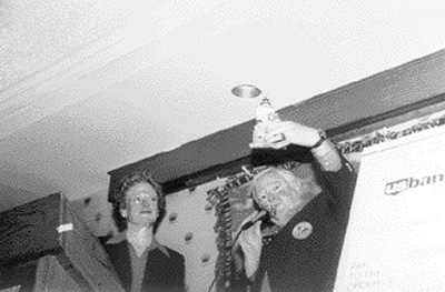 Tim Harrison (r) of The American Lighthouse Foundation holds up the Harbour Lights replica of Clarks Point Lighthouse for the audience to see in a recent foundation fund raiser. Kim Andrews, who presented the artist’s proof of the replica to The American Lighthouse Foundation, looks on. Back to the edition of: August 2002