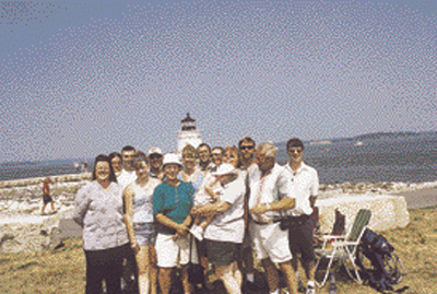 Deborah Conley (holding Lily Conley) and Judith Kelley (in green), great granddaughters of Keeper William T. Holbrook, paused for a photo in front of the lighthouse with their families. From left to right: Karen Hill, Kayla Dinsmore, Ryan Kelley, Alicia Kelley, Rick Kelley, Judith Kellley, Carol Kelley, Craig Conley, Kim Conley, Deborah Conley with Lily, Bill Kelley, Joe Conley, and Scott Kelley. Their father was born at the lighthouse during their grandfather’s service at Bug Light from 1909 until 1919.
