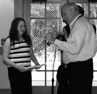 Tim Harrison, president of the American Lighthouse Foundation presents Candice Sylvia, the New Bedford school student who won the essay contest, with one of her numerous awards. Back to the edition of: November 2002