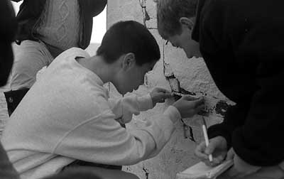 The Lighthouse Kids measure the cracks in the brick lighthouse in October 2002. Back to the edition of: January 2003