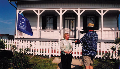 Grace Jackson Weaver being interviewed at the First Day of Issue Ceremony for the Southeastern Lighthouse Postage Stamps at Tybee Island Lighthouse, Georgia. Grace is the daughter of the last keeper of the U. S. Lighthouse Service to live in the head keeper’s house. She was born at the St. Simons Lighthouse in George where her father was the assistant keeper. They moved to Tybee Island Lighthouse in 1931 when she was five years old. As a child she didn’t think it was anything special living there saying, “It was like having a big night light.”