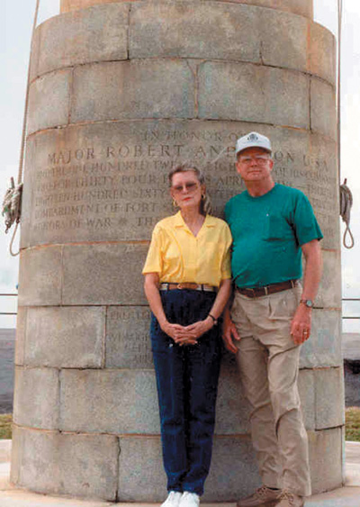 Anne (Gullette Moore) and her brother Jim (Sonny) Gullette pose by the flagpole monument at Fort Sumter—then & now. Photo courtesy of J. Carl Guillette.