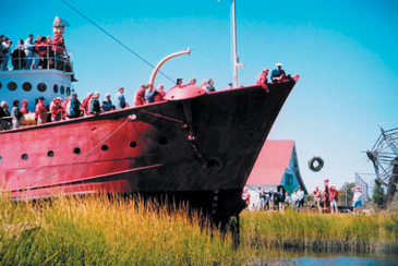 (L to R) USCG Lightship Sailors president Dennis Cosmo and USCG Lt. Brian Wazlavek drop a wreath into Lewes Canal in honor of fallen lightship sailors. Photo by Bob Trapani, Jr. Back to the edition of: November 2003