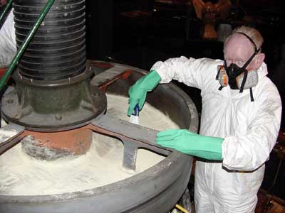 Lens restoration can be hazardous, especially when mercury is involved. Here, Jim Woodward removes the mercury from the second order lens of White Shoal Lighthouse, Michigan, now on display at the Shipwreck Museum at Whitefish Point. Photo Courtesy of Jim Woodward Back to the edition of: Aug/Sep 2004
