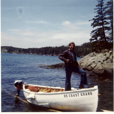 Seaman Gary Sill from Ohio on the small wooden boat with a 9-hp Johnson outboard that took the crew from the island to the mainland. Back to the edition of: December 2004