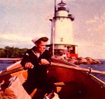 Keeper Moreland rowing from the mainland back to Tarrytown Light with the weeks groceries in the boat. (1956)