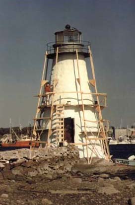 Palmer Island Light, MA, undergoing repairs in 1989. The lighthouse has since been vandalized. Back to the edition of: April 1999