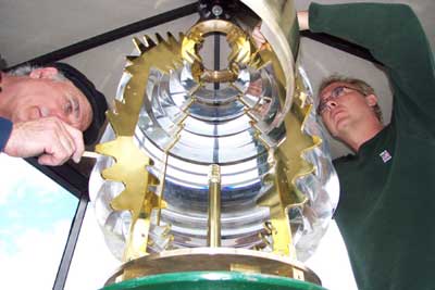 Gary Knappenberger and Ed Gunn make the final touches to the installation of the lens in the lantern room. Back to the edition of: July 2005