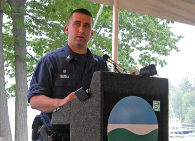 Representing the Coast Guard, Chief Boatswain Mate Gregg Marsili spoke at the celebration. He is the officer in charge at Coast Guard Station Burlington, on the Vermont side of Lake Champlain. Back to the edition of: August 2005